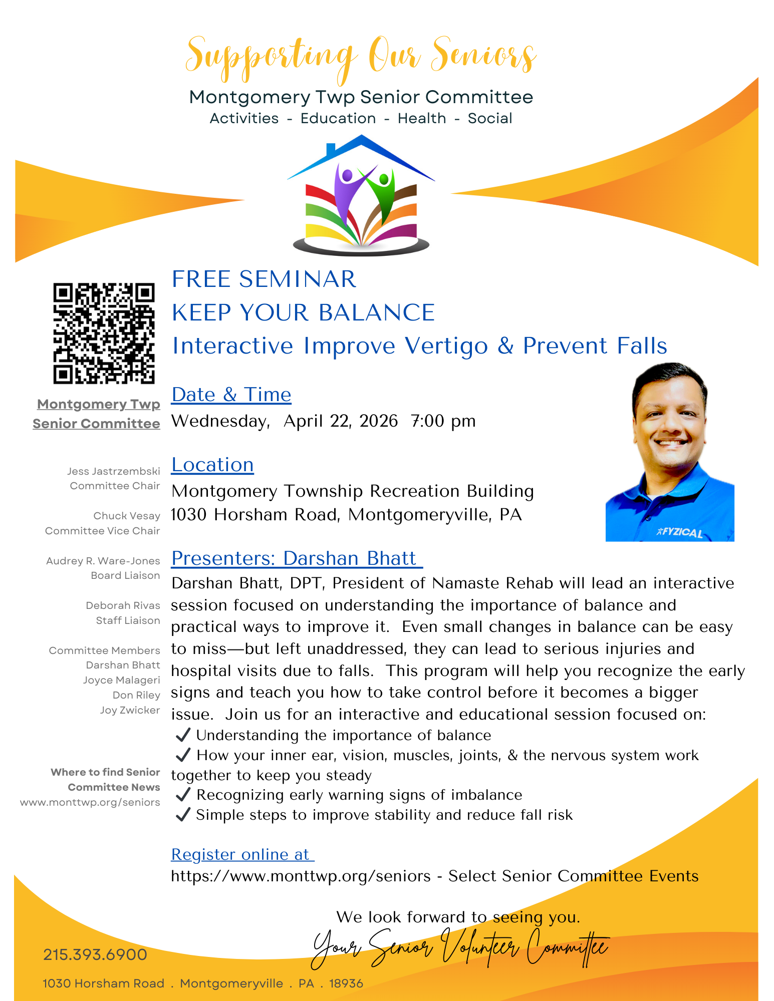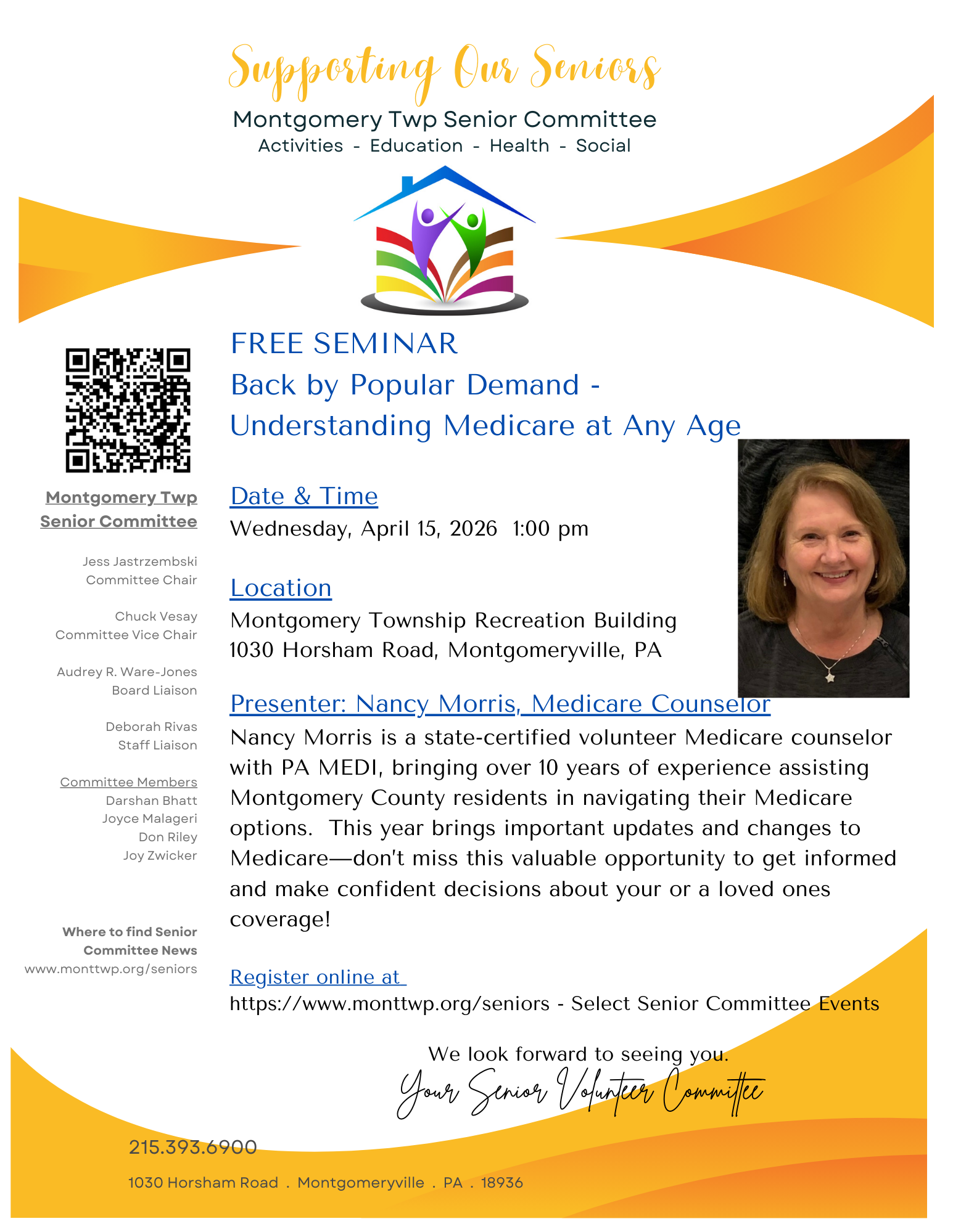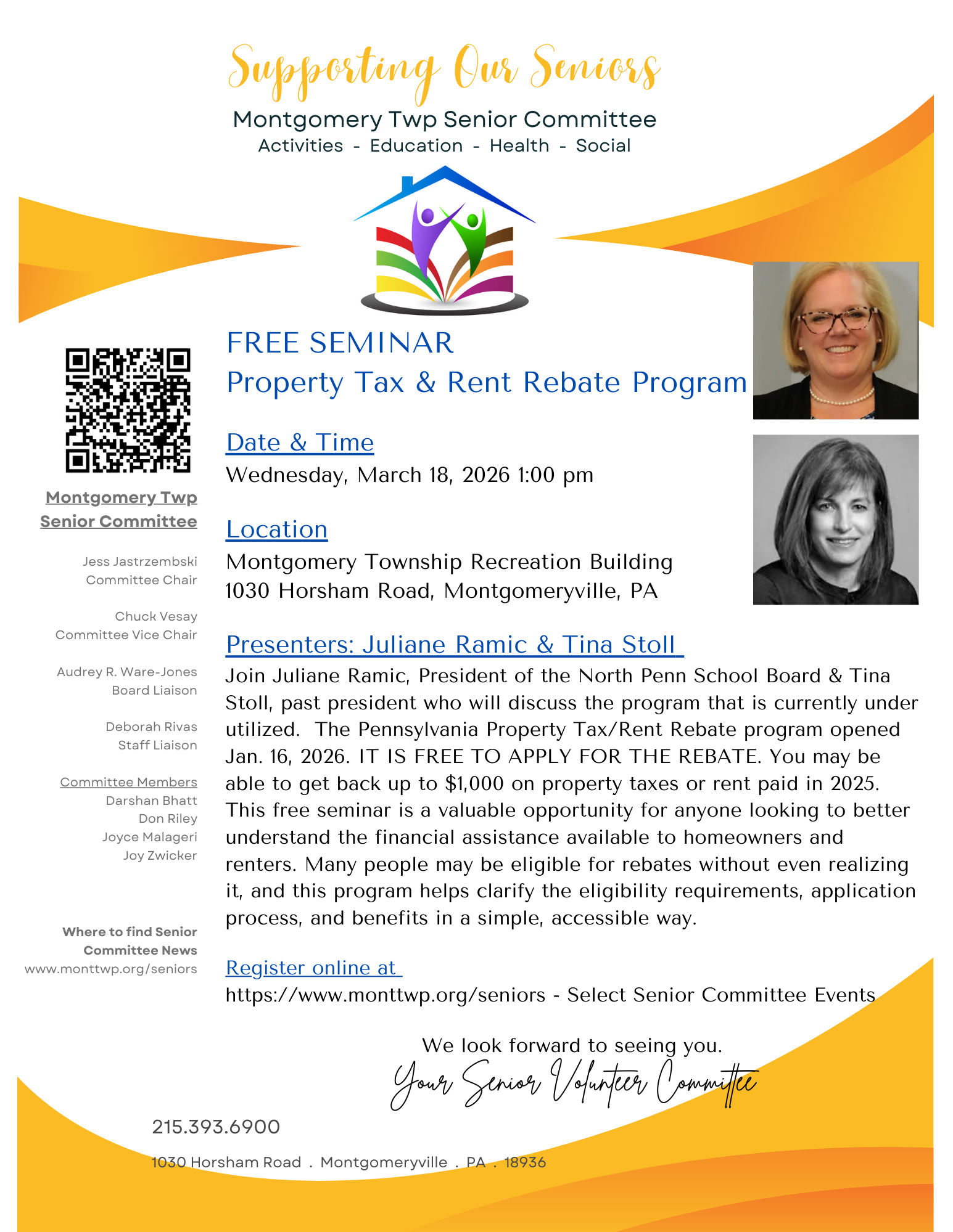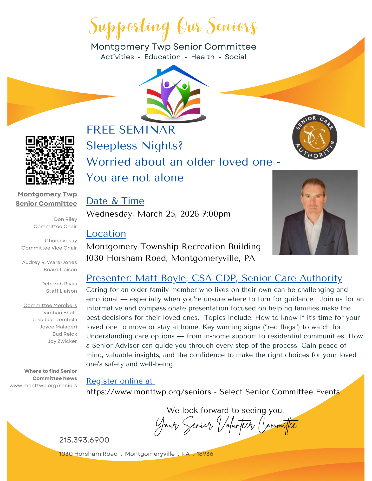 All seminars take place at the Montgomery Township Community & Recreation Center, located at 1030 Horsham Road, Montgomeryville, PA 18936, unless otherwise noted.