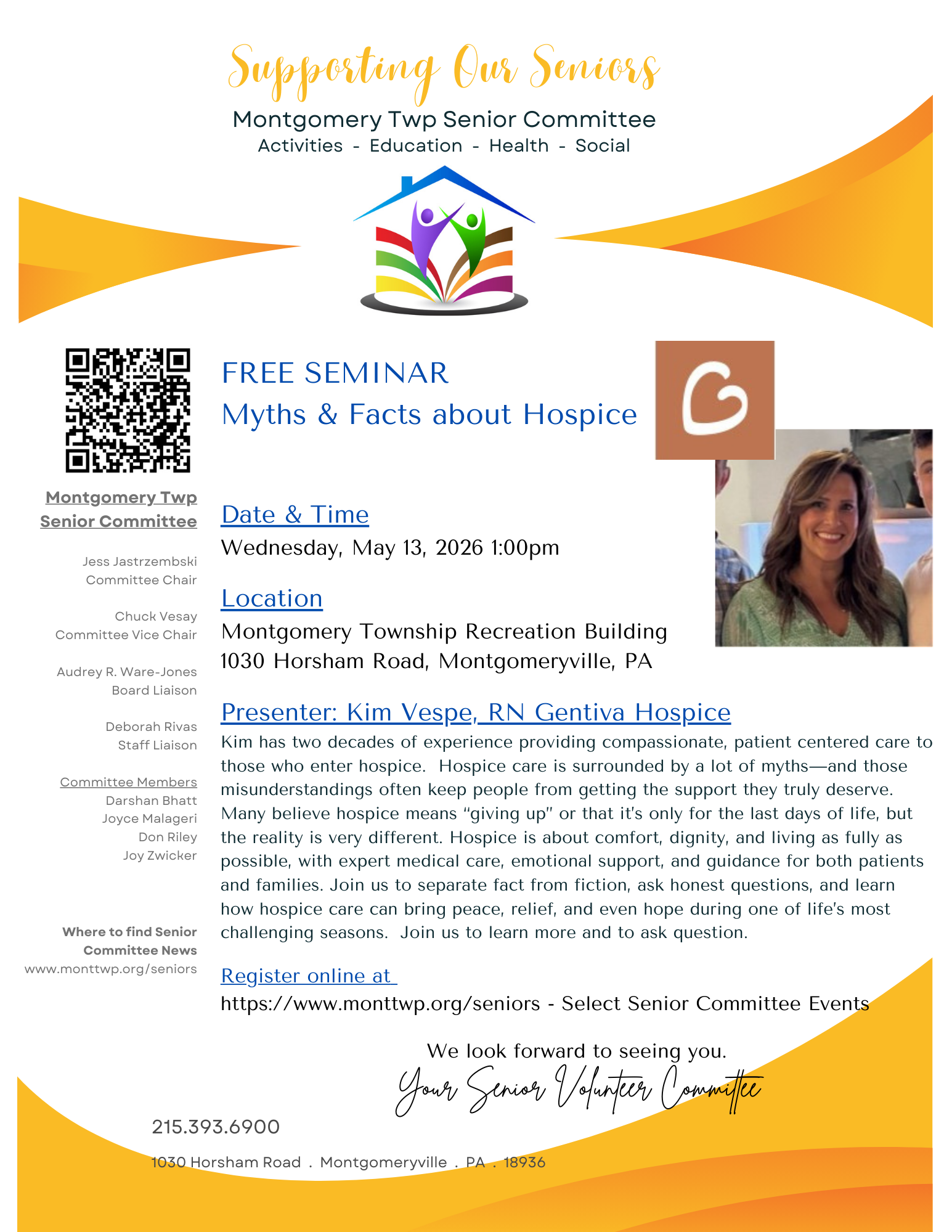 The Montgomery Township Senior Volunteer Committee coordinates free seminars throughout the year to serve as resources for our senior citizen population and their caregivers.